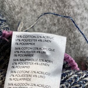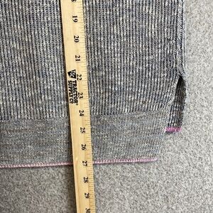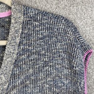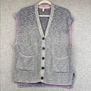 Soft knit vest/cardigan. Button up with pockets. Split sides seams allows sweater to lie flat. Heathered yarn gives acid washed look with contrasting pink trim. Big, chunky style buttons. Pilcro for Anthropologie. Sold out on website.