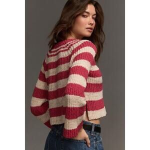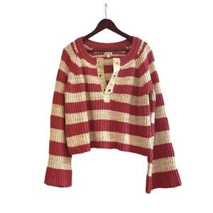 Pilcro Womens Sz Large Bell Sleeve Henley Sweater Red Beige Stripes Cropped NEW