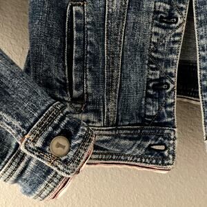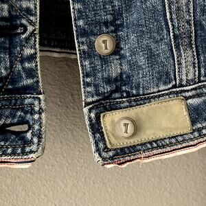 Stonewashed, distressed jean jacket with leather tab and ribbon trim details. Metal buttons, two side pockets and double chest pockets. Has a slightly acid washed look. Semi-cropped depending on the length of your torso - see measurements below.