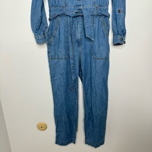 Stylish blue denim jumpsuit. Features button-up front and tie waist. Long sleeves with rolled cuffs. Perfect for casual wear.