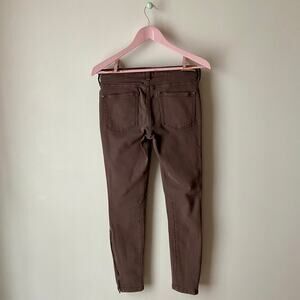 Brown skinny jeans/pants with a bit of stretch to them and with zipper pockets/zipper openings at the ankles. By Pilcro and the Letterpress. Great preowned condition. Size 28. Measurements in photos.
