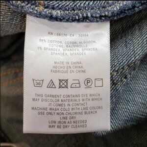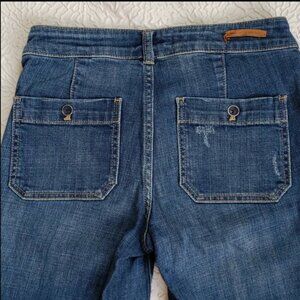 Designed with a purposefully distressed look. Darts at back allow for a roomier seat combine with patch pockets for an overall slimming effect.