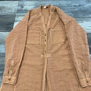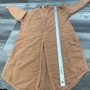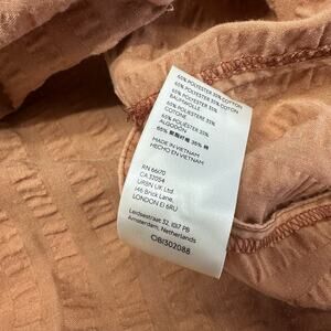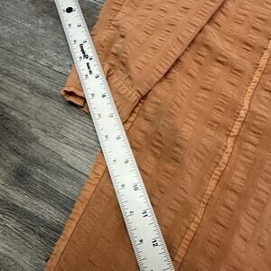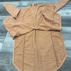 Pilcro and the Letterpress Seersucker Orange Women's XS Menagerie Boho Tunic Top long sleeve button front closure half length side slit front pockets buttoned cuffs textured woven tunic style shirt curved hem polyester cotton lightweight casual top made in Vietnam lagenlook