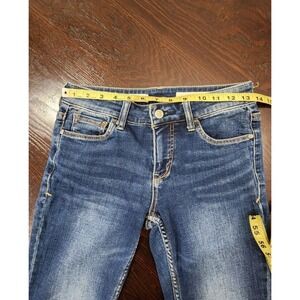 Elevate your style with these Pilcro and the Letterpress skinny jeans in size 25. Made from a comfortable blend of cotton and spandex, these jeans feature a distressed solid pattern that adds a touch of edge to your look. The 5-pocket design and zip fly with button closure provide both practicality and style. These dark wash jeans have a slim fit with a mid-rise of 8.5-10.5 inches and an inseam of 25 inches. Perfect for any season, these jeans are versatile and can be dressed up or down. They come with belt loops and are machine washable for easy care. Don't miss out on this stylish addition to your wardrobe!