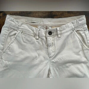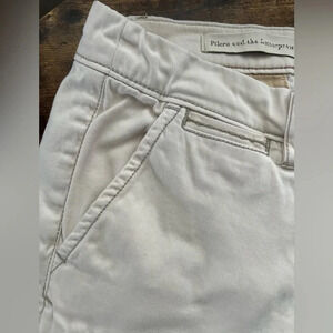 Pilcro and the Letterpress | women’s pants. Size: 31. 99% cotton, 1% spandex. Color: cream with tan stitching. Zippered fly with button closure. There are a few very tiny spots (see picture). 5 pockets, 2 slide in side pockets, 2 back pockets and 1 coin slot pocket. *the size tag is not in pants, waist is by measurement*