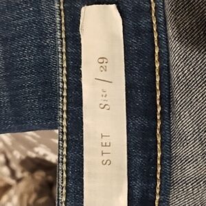 26 in inseam. Straight leg. Side slits at ankle.button zip. A little tag on the back is falling off.