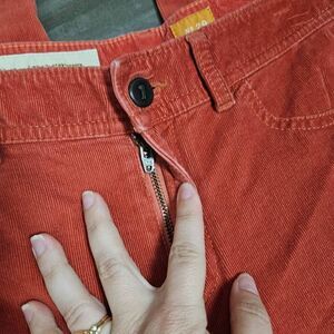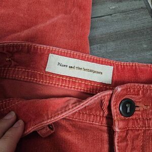 This is a pair of the Serif style corduroy pants by Pilcro and the Letterpress. They are a light coral color.