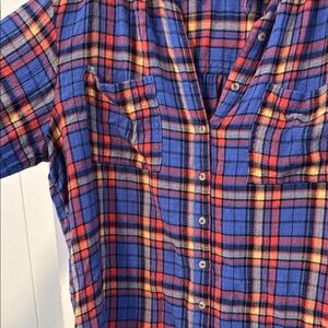 Stylish blue and red plaid button-up shirt. Features a classic design with front pockets.