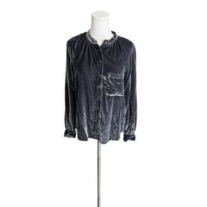 Elevate your look with this luxurious velvet button-down from Pilcro, sold at Anthropologie. Featuring voluminous balloon sleeves and a rich dark charcoal gray hue, this top adds texture and drama to any outfit. Perfect for dressing up denim or pairing with tailored trousers.