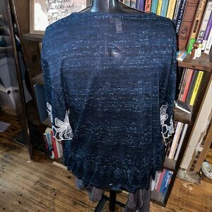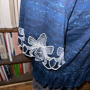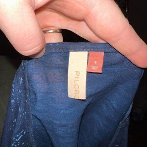 Pilcro Anthropologie blue, lacy sleeves, boho, flowy blouse. Beautiful top that pairs well with jeans, slacks, or a skirt. Approximately 22 inches from armpit to armpit, 23 inches long. In good, used condition. From a pet and smoke free house.