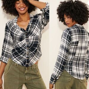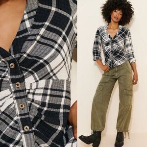 Pilcro Plaid Ruched Button-Down Blouse | Large