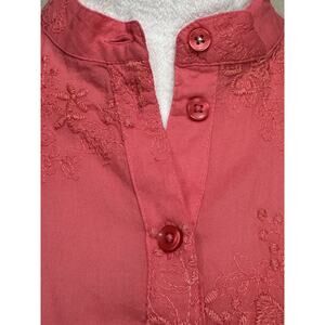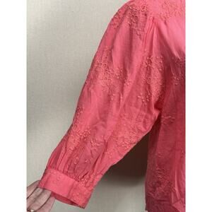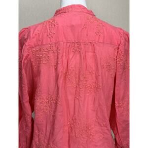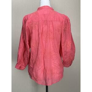 This beautiful Pilero blouse from Anthropology is a must-have for any wardrobe. The deep coral color with embroidered flowers creates a feminine and spring-like feel, perfect for any occasion. The 3/4 balloon sleeves and button closure add a touch of elegance, while the blouse's fit and material (100% cotton and polyester) make it comfortable to wear for all seasons.