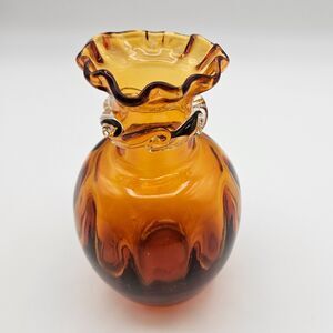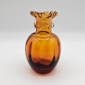 Pilgrim Glass Bud Vase Honey Amber Hand Blown Art Glass Rigaree Ruffle Rim Vintage