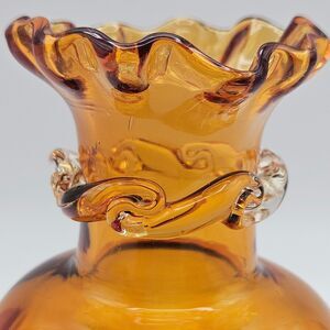 Beautiful amber glass bud vase by Pilgrim Glass Company. Draped blown glass in a warm honey amber color. The vase has a flared crimped edge, rigaree ruffle rim with an applied, twisted clear glass collar.