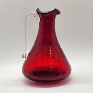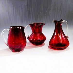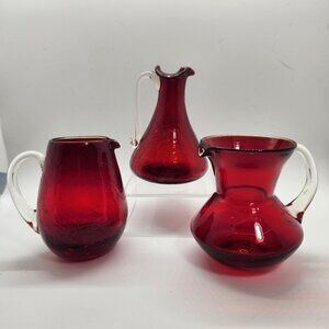 Set of 3 mini pitchers/creamer set in a deep ruby red color. Assorted sizes and shapes make an attractive shelf display or use as posey vases. These would be great for so many holidays - Christmas, Valentines, Fourth of July or any day! They could even be hung on a themed Christmas tree as ornaments. These are individually mouth blown so the shape of each of them will vary. Two are crackle glass and one is smooth. All are unmarked and would have had a foil sticker originally. The tallest is possibly Rainbow Glass, the other two are by Pilgrim. The Rainbow pitcher glows orange (which means it may have Manganese in it as a colorant.)