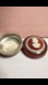 Dark carnelian red color with cream color in the center. I have modified this with a resin cameo. Translucent amber colored base with the creamy Ivory colored right face silhouette Cameo woman. I then bordered it with mini white pearl beads. The faux pearl beads are new, but the Cameo is vintage.