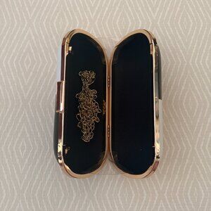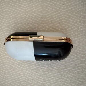 Black and white 500mg pill clutch. Comes with removable gold chain that can be tucked inside