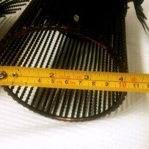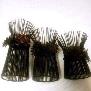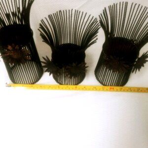 Pre-owned in good condition: These set of 3 wrought iron pillar candle holders are a must have. They are 3 different sizes from small to medium to large sizes. They are of a black bronze wrought iron metal material made in China. They have an adjustable floral design in front and hold pillar type candles not included. The largest candle holder measures10" in height, 5.5" width at top opening, and 4" width at base. The medium candle holder measure 8.25" in height, 5.5" width at top, and 4" at base. The smallest candle holder 7"in height, 5.5" in width at top, and 4" width at base. There is some rusting discoloration on the inside of candle holders, underneath inside, and on flowers. See photos for details. These candle holders add additional beauty to any home decor.
