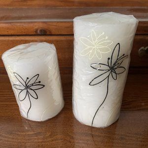 Beautiful candles in white with black and white flowers. 6 inch and 4 inch. Small dent on large one from storage. Wrapped in plastic