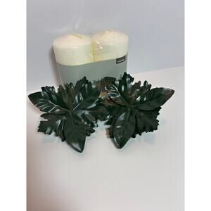 Dress up your holiday or any day table decor with this bundle of 2 NEW fragrance free pillar candles (6” tall) and gently used green metal holders with a leaf motif (6” wide).