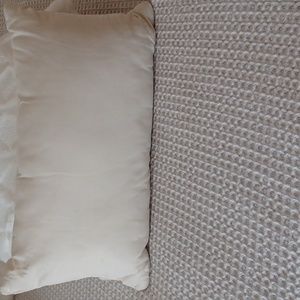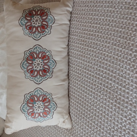 9x16 deco pillow with rust and lt. blue tone stitches. cream background. cover not removable but is washable.