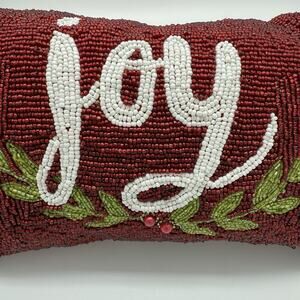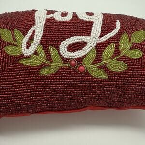 Pillow Red Fully Beaded Front Joy & Holly Leaves Satin Back Holiday Xmas 14x9x5
