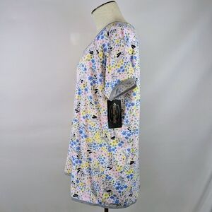 TOP: Rounded neckline. Short sleeves. Soft polyester spandex blend fabric with stretch. Allover dogs, flowers, and bees print. Relaxed fit. Slips on over head.