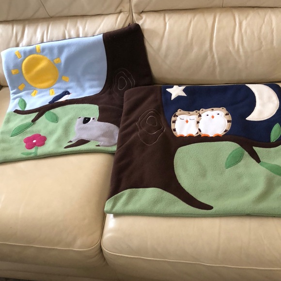 Set of 2 decorative pillow covers, 18”x18”, day - night scene on each side, with hidden zipper opening (see pics), Covers only, pillow/inset not included. Preowned.