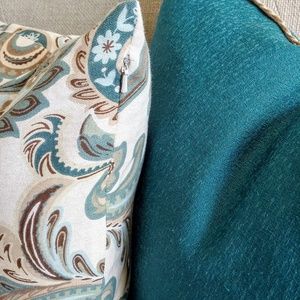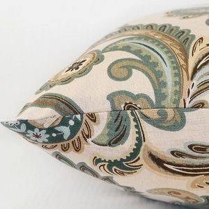 Two paisley print pillow cover with invisible zipper. Shades of blue green and taupe on a natural background. I paid $22 a piece for these on etsy. They have just sat on my office sofa for 2 years and ive decided to change some decor around. Look brandnew. Slip covers only. Willing to sell teal pillows also at an additional cost. Also in excellent condition.