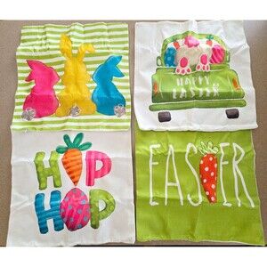Lot of 4 new pillow case covers that are made of linen. Each has an invisible zipper and measures 17.5" across, and 17" tall. For both indoor or outdoor use, but I think these would look better outside on some patio furniture. Cute and colorful Spring and Easter patterns with rabbits, easter eggs, and carrots. Main colors are green and cream. These could use some ironing before use, they are a little wrinkled.