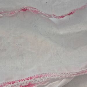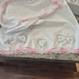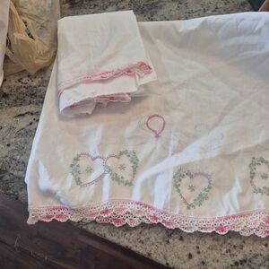 Pillowcases (2), White Cotton, Vintage Pink Variegated Crochet Heart Embroidery Started on one, faint design on 2nd
