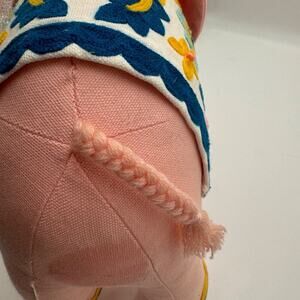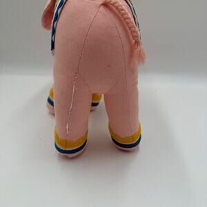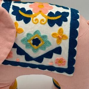 Adorable and intricate, this handmade pink elephant plush toy is adorned with a colorful embroidered blanket and a charming tassel tail, adding a whimsical touch.
