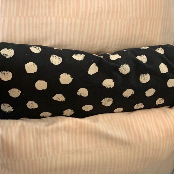 Pink and white stripe pillows and a black and white polka dot pillow