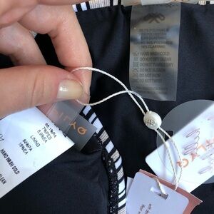 This PilyQ PQ Swim bikini has a bandeau top complete with removable straps, removable cups, and grip inlay on top to ensure the most support. The Harbour stripe hipsters are low rise full coverage bottoms with clean finish seams.