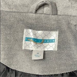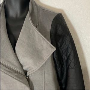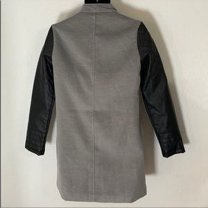 This jacket is a grey pea coat style. Has the faux leather sleeves with asymmetrical zipper. Looks super classy! Can be dressed up or down. Only worn a couple of times so excellent condition. Size M.
