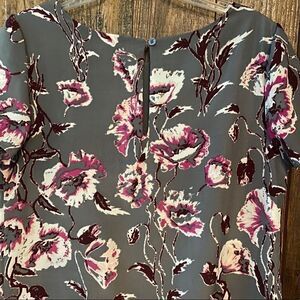 Gray with purple flowers, short sleeve, button back close, shift dress