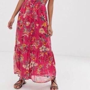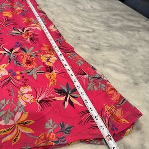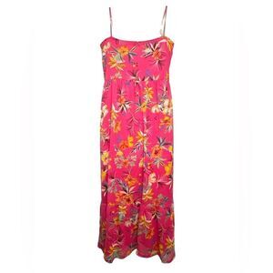 Size and care tag missing but fits like a medium (see measurement). In excellent condition. Color is pink with a beautiful floral design. Buttons all the way down. Straps do not adjust. Perfect for vacation and spring to summer wear.