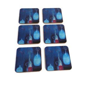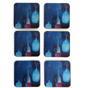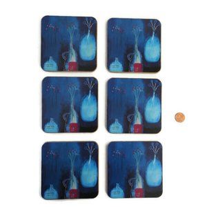 Pimpernel laminate cork coasters, Changing Flowers by Emma Davis. Blue and pink colors. 4" X 4". Set of 6. Excellent condition. There is no original box.