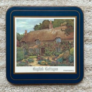 Pimpernel Coasters English Cottages - Set of 6 Cork Backed Barware Vintage - dark blue edging.