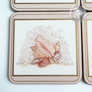 Preowned/vintage coasters, a set of 6, made by Pimpernel and called "Shells" style #9018. Pretty coasters made by Pimpernel and made in England. Preowned/vintage with some signs of use and wear from storage: while these coasters don't appear to have been used (see photos of bottoms), they were stored with the box opened and one coaster shows some marks and scratching, hard to see unless closely inspecting (see pic 4). Come with original box.