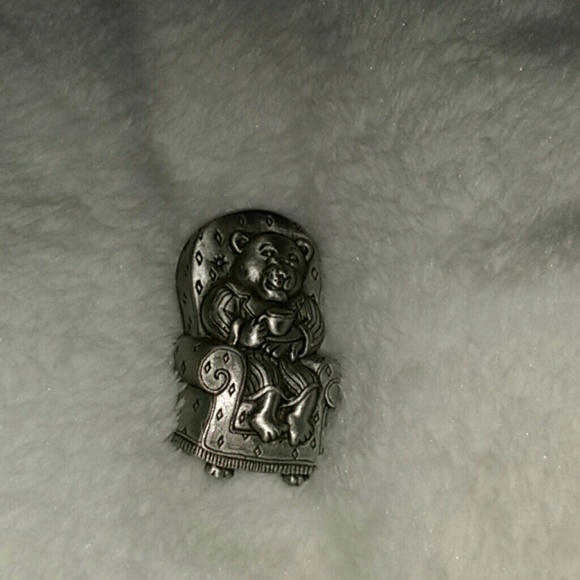 Bear sitting in chair holding a cup and saucer
