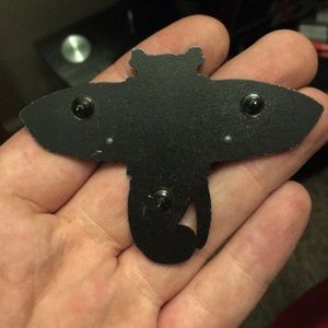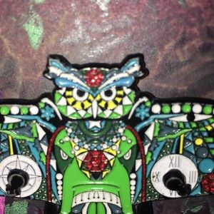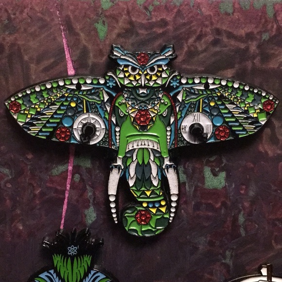 Psychedelic elephant/owl hybrid pin with small gems and spinning clock and compass for look on front. Truly a piece of art and more than your average pin