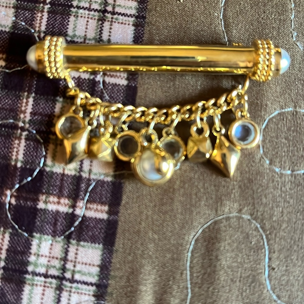 St Jonn Gold tone Bar pin , Faux pearl and dangle charms Never used