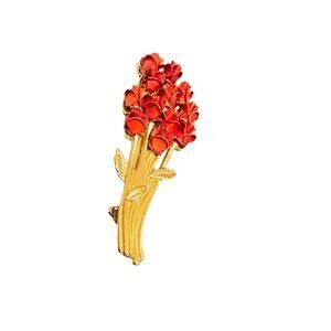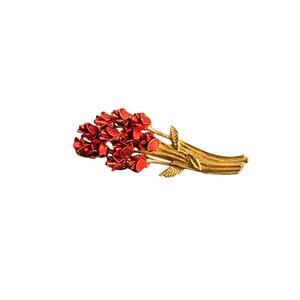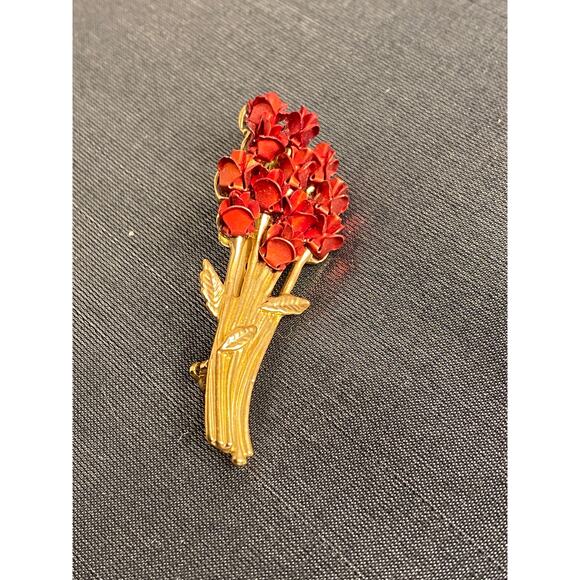 Pin Brooch Bouquet of Red Roses Goldtone 2 in X .75 in Marked Joesph Warner (W)