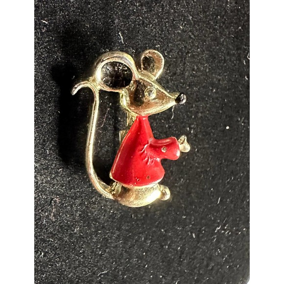 Add a touch of whimsy to your outfit with this vintage goldtone mouse brooch. The adorable critter is dressed in a red shirt, making it a playful addition to any jewelry collection. Measuring just 1 inch in length, this brooch is perfect for any occasion and can be worn by both men and women.