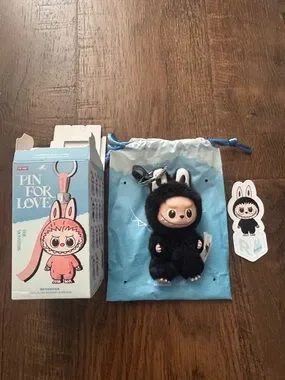 Cute black plush keychain with bunny ears. Comes with blue drawstring pouch and matching sticker. Soft and collectible. Ready to add to a bag or keys.