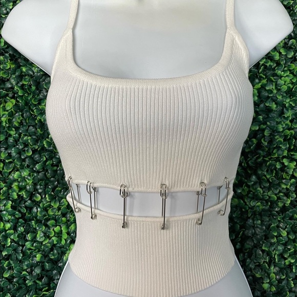 This cute off white top needs to be in your closet this summer girl. From jeans, skirts, and shorts this top will give any look a cute edgy finish. This crop top features ribbed knit material with spaghetti strap & front opening with safety pins. Pair it with heels or sandals and a handbag for a complete look.