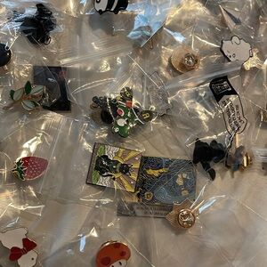 May be some duplicates but I try to minimize it as much as possible. Will include some free pins as well as a gift. There are some cat pins in the pictures and those are all gone now.