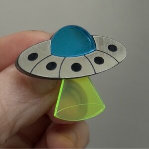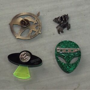 Fun bundle of pins for a backpack, Jean jacket or messenger bag! Hunger Games, unicorn/winged alpaca, ufo, and sparkle alien. The Hunger Games and enamel alpaca are metal, the alien and ufo are plastic/resin.