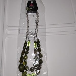 Varying in shape, size, and opacity, a refreshing collection of Olive Branch acrylic and crystal-like beads join silver discs along invisible wires that flawlessly layer below the collar for an earthy pop of color. Features an adjustable clasp closure.